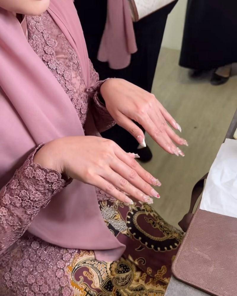 Detail lain yang mungkin terlewatkan adalah nail art yang dikenakan Salma. Setelah selesai make up, ia tiba-tiba ingin mempercantik kuku dengan nail art.
