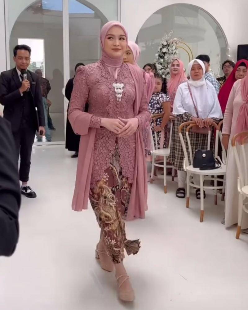 Di hari spesialnya ini, Salma memilih kebaya berwarna peach. Model kerah setali pun jadi pilihannya. Detail aksen renda tepi memberikan kesan yang lebih feminin dan manis. Tambahan selendang di salah satu bahu memberikan kesan yang elegan.