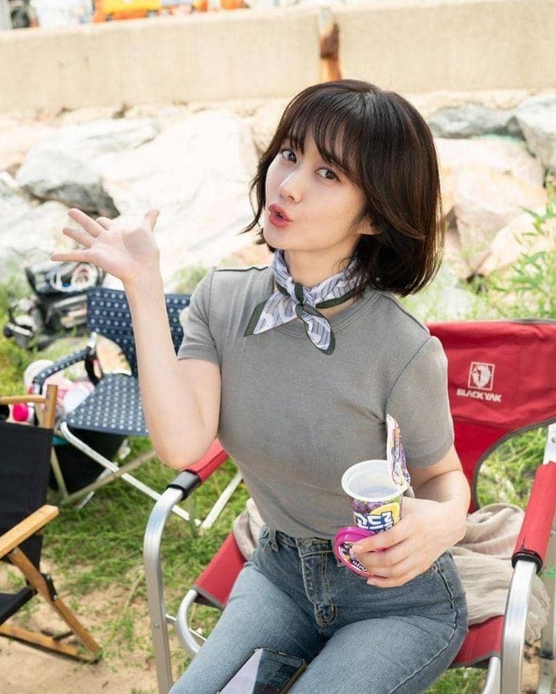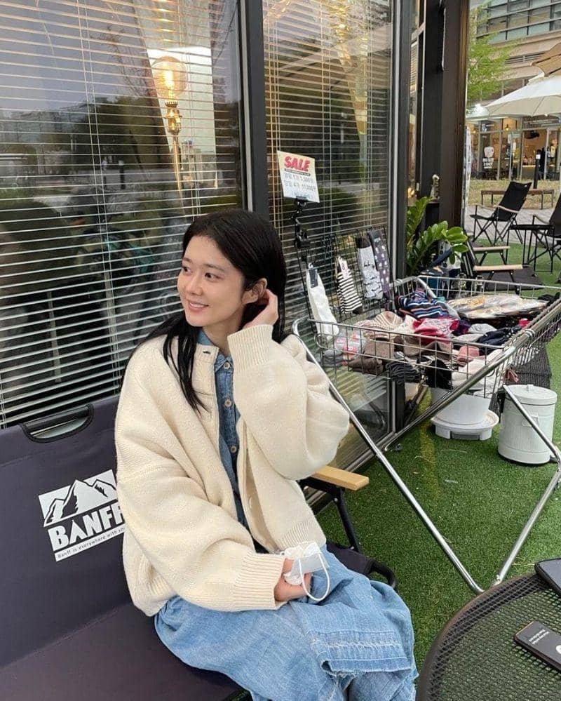 Namun, Jang Nara membuktikan bahwa jaket oversize bisa tetap stylish. Ia memadukan jaket tersebut dengan kemeja dan jeans serasi berwarna biru muda, hingga menciptakan penampilan yang memukau sekaligus imut.