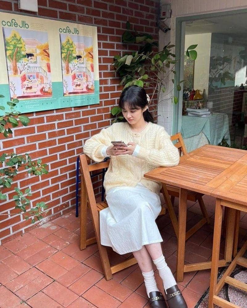 Jang Nara tampil estetik hanya dengan dua item sederhana. Dirinya hanya memadukan rok putih bertekstur lembut dengan sweater kuning berpotongan v-neck.