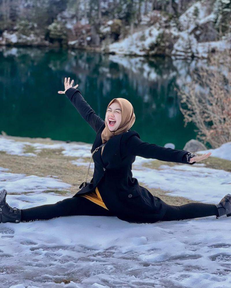 Salah satunya seperti ketika ia menghabiskan waktu untuk liburan di Swiss. Pada unggahannya, terlihat perempuan bernama asli Ria Yunita ini melakukan pose split saat berada di pinggir danau yang dikelilingi salju.