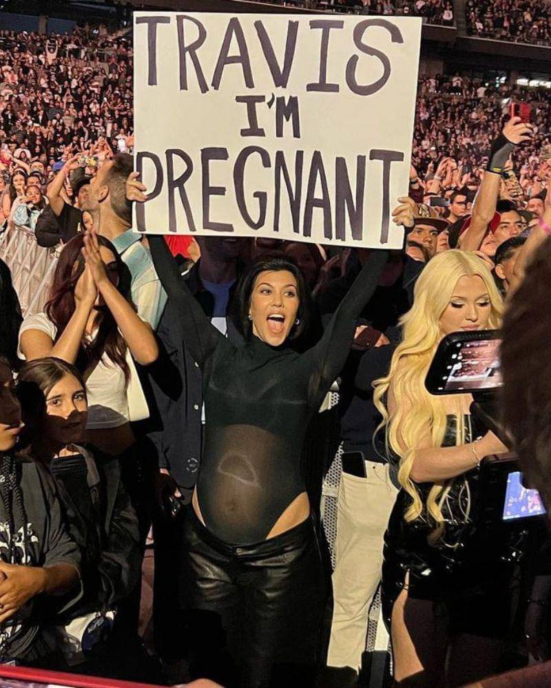 Dari tengah-tengah kerumunan penonton konser Blink-182, Kourtney dengan antusias menunjukkan kertas bertuliskan "Travis I'm pregnant" yang berarti "Travis aku hamil". Momen tersebut juga diabadikan dan diunggah melalui akun Instagram resmi Kourtney Kardashian, yakni @kourtneykardash.
