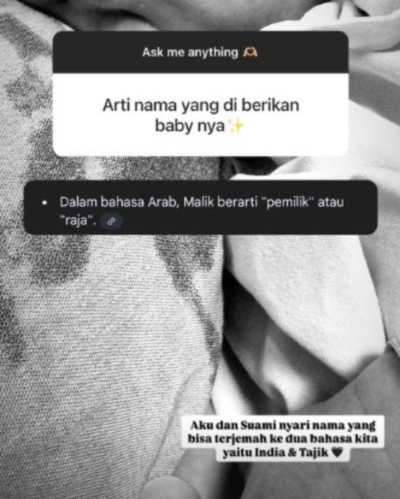 Lewat unggahan di Instagram Story-nya, Jharna menjawab pertanyaan warganet mengenai arti nama Malik Nasimov yang diberikan untuk putra tercintanya.