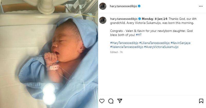 "Thanks God, our 4th grandchild, Avery Victoria Sukamuljo, was born this morning. Congrats - Valen & Kevin for your newlyborn daughter. God bless both of you! #HT," tulis Hary Tanoesoedibjo pada caption unggahannya.