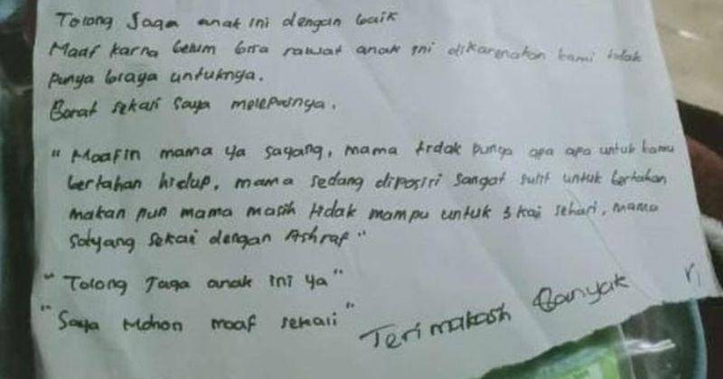 "Tolong jaga anak ini dengan baik. Maaf karna belum bisa rawat anak ini dikarenakan kami tidak punya biaya untuknya. Berat sekali saya melepasnya. Maafin Mama ya sayang, Mama tidak punya apa-apa untuk kamu bertahan hidup. Mama sedang di posisi sangat sulit untuk bertahan makan pun Mama masih tidak mampu untuk 3 kali makan sehari Mama sayang sekali dengan Ashraf," tulisnya.