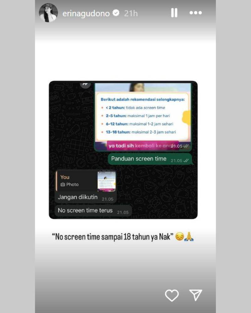 Dalam Instagram Story-nya, Erina Gudono membagikan tangkapan layar percakapan WhatsApp yang membahas soal panduan screen time untuk anak berdasarkan usia.