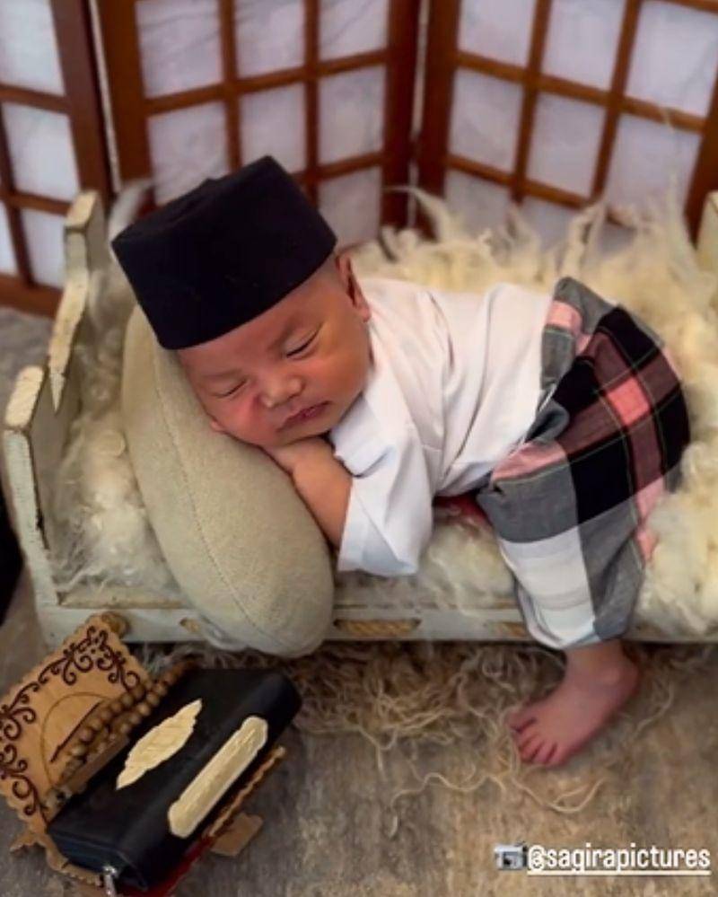 Tak hanya itu, Baby Aflah juga mengenakan peci hitam di kepala mungilnya. Tak ketinggalan, properti berupa Al-Qur'an dan tasbih juga semakin mendukung photoshoot Baby Aflah yang bernuansa Islami.