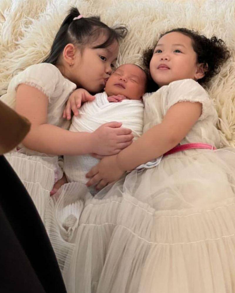 Momen penuh kasih sayang terlihat jelas saat kedua kakak Baby Aflah, Arsila dan Alia berpose bersama sang adik yang baru lahir. Dengan mengenakan gaun putih senada, keduanya tampak begitu lembut memeluk Baby Aflah yang sedang tertidur.