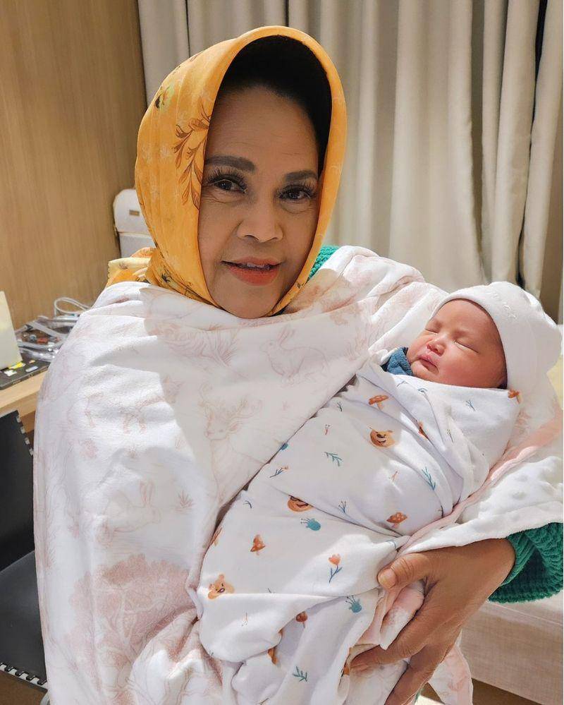 Seperti yang terlihat, Hetty Koes Endang berfoto dengan cucu keduanya sambil menggendong cucu pertama dari Afifah Yusuf. Raut bahagia pun terpancar dari penyanyi lagu 'Mitoha' ini karena bertambah lagi satu cucu tercinta.
