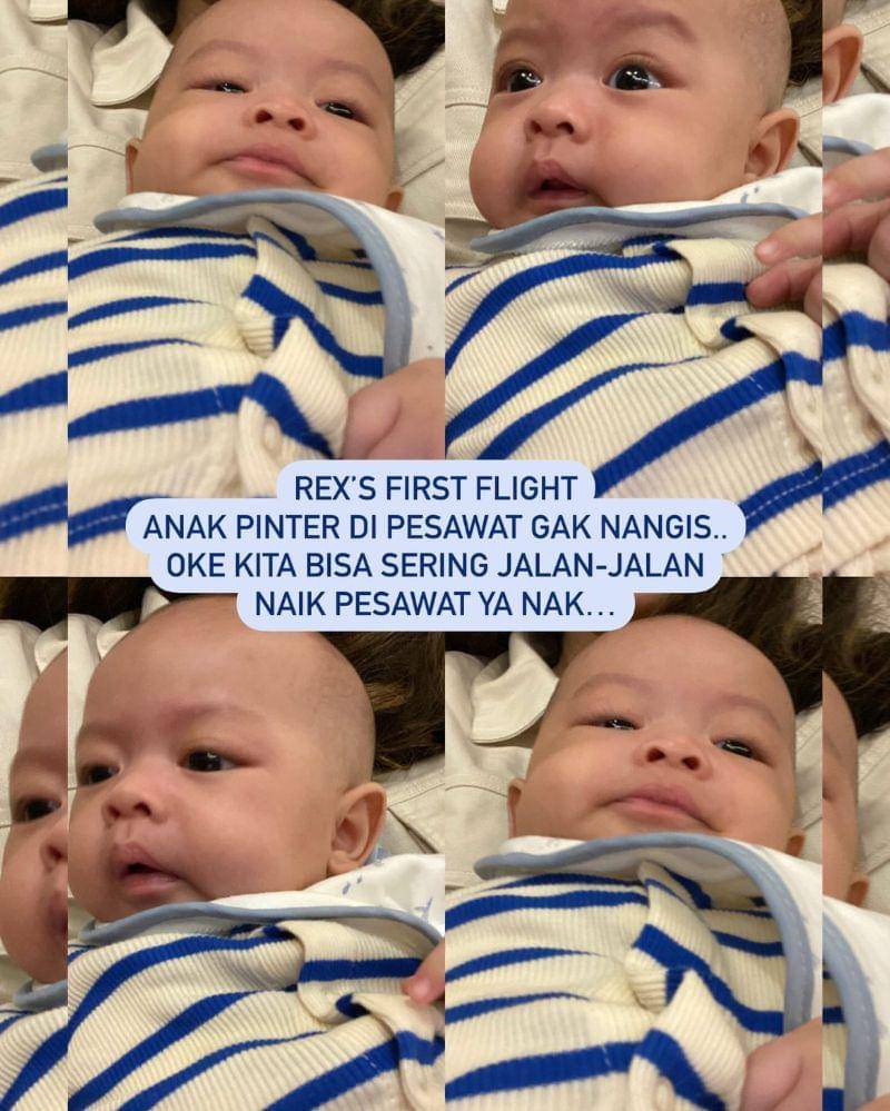 Dalam potret yang dibagikan oleh Andamari di Instagram Story-nya, Baby Rex rupanya sedang menikmati perjalanan pertamanya dengan pesawat. Meskipun menjadi pengalaman yang pertama, namun bayi berusia tiga bulan ini tampak anteng saat berada di dalam pesawat.
