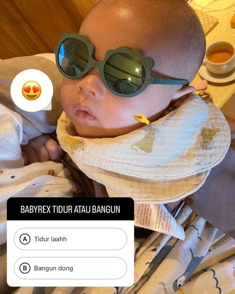 Beralih ke Instagram Story selanjutnya, kali Ini Baby Rex tampil dengan mengenakan kacamata hitam. Kacamata tersebut tampak membuat bayi kelahiran 23 Agustus 2023 ini semakin imut dan menggemaskan.