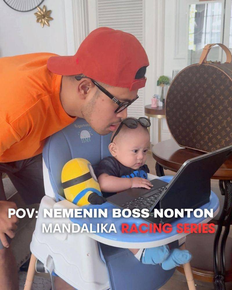 Baby Senna tampak duduk di kursi bayi sambil fokus menatap laptop. Rupanya, Papa Gilang mengajak Baby Senna menyaksikan Mandalika Racing Series.