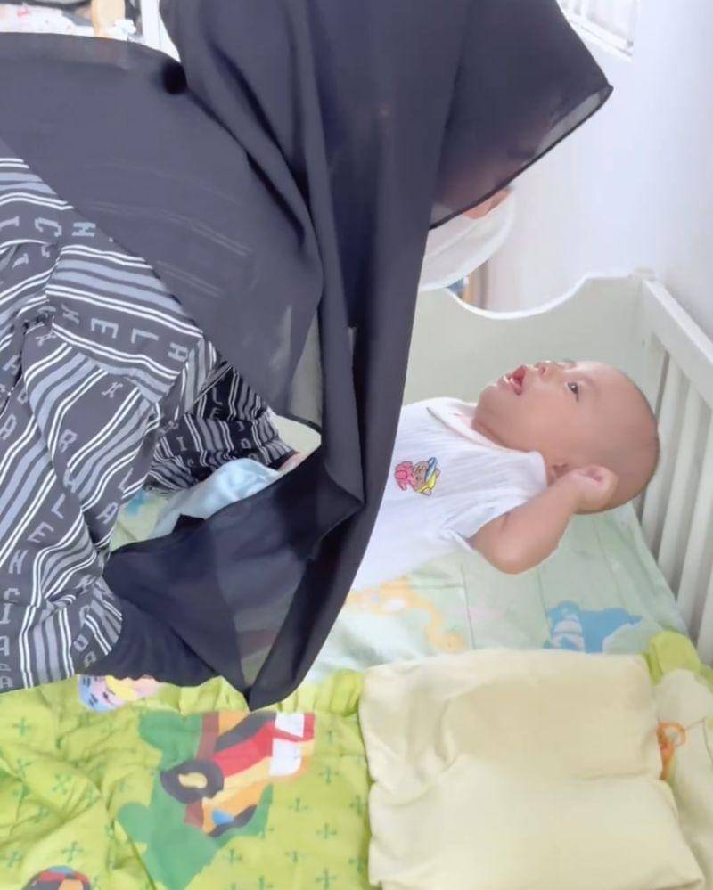 Mulai dari menemani sang bayi mendapatkan vaksin, memberikan susu, hingga menggendong dan menimang bayi laki-laki tersebut dengan penuh kasih sayang.