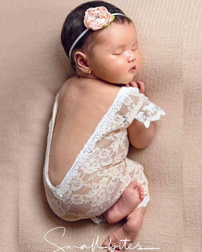 Uniknya, Baby Zeya mengenakan baju renda semi transparan dengan model belakang terbuka atau backless.