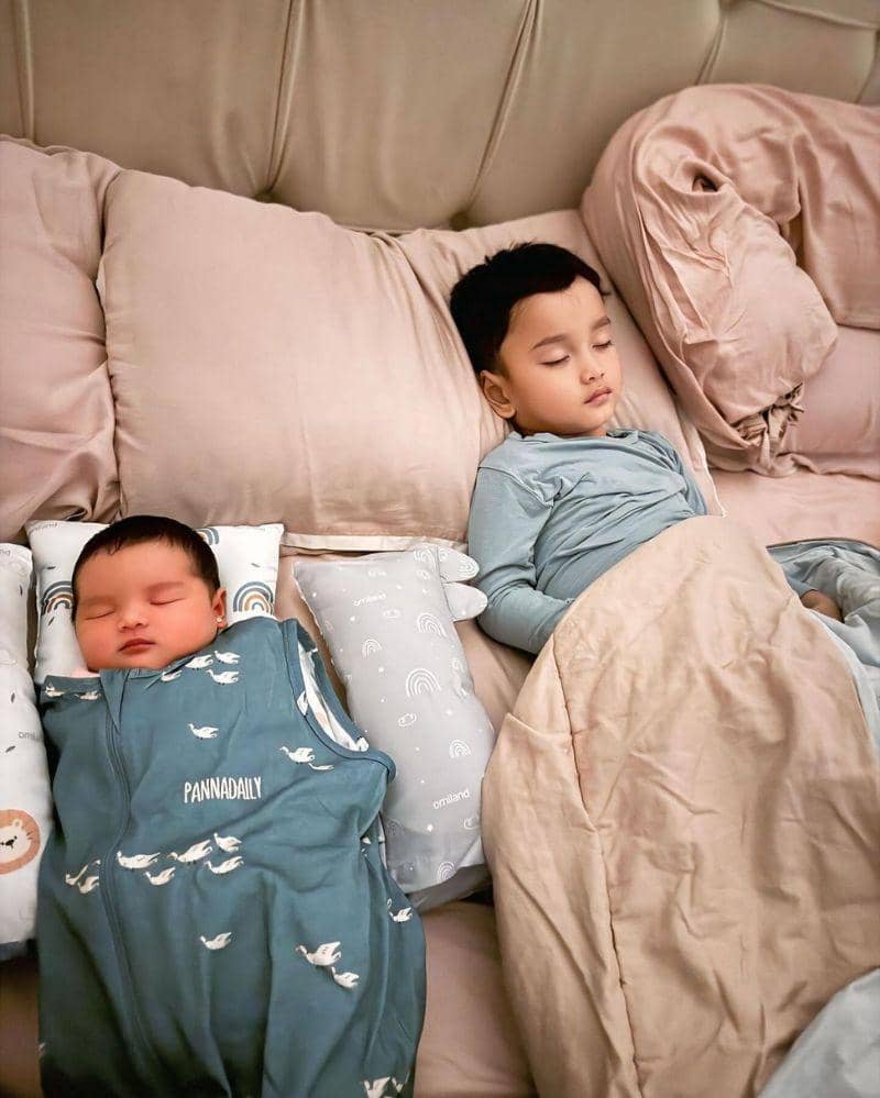 Momen kedekatan Baby Zeya dan Kakak Eshan pun terlihat dalam foto yang satu ini. Baby Zeya tampak tidur bersama Kakak Eshan di ranjang yang sama.