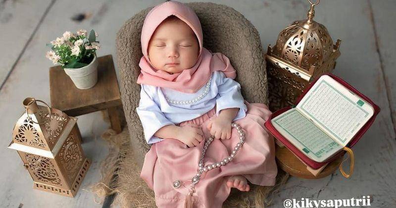 Selain itu, terdapat properti tasbih dan Al-Qur'an yang menambah nuansa Islami. Rupanya, tema newborn photoshoot ini dipilih dalam rangka menyambut bulan Ramadan.