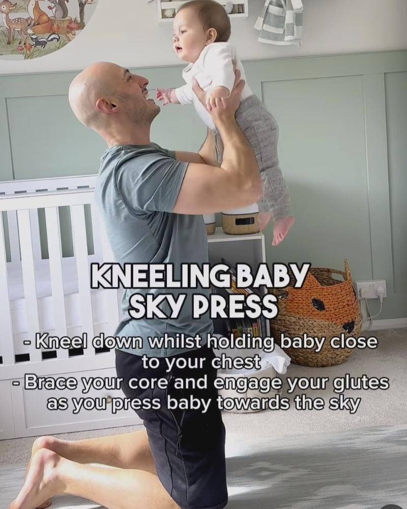 Gerakan selanjutnya adalah kneeling baby sky press. Gerakan ini cukup mudah untuk dilakukan, Mama dan Papa bisa berlutut sambil memegang bayi di dekat dada.