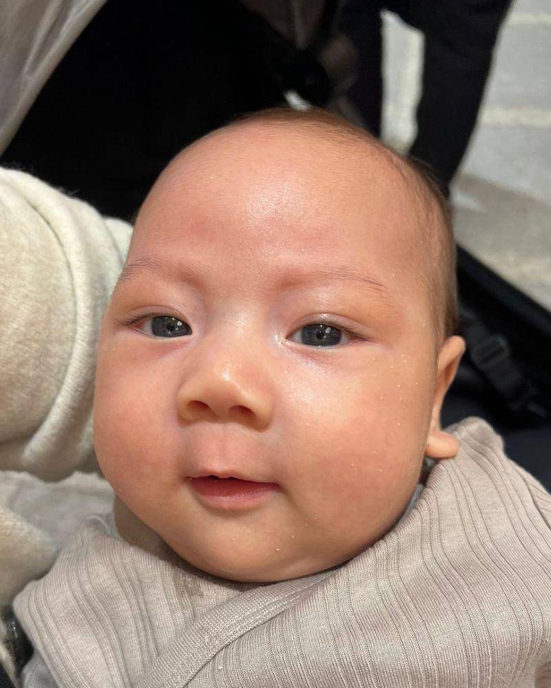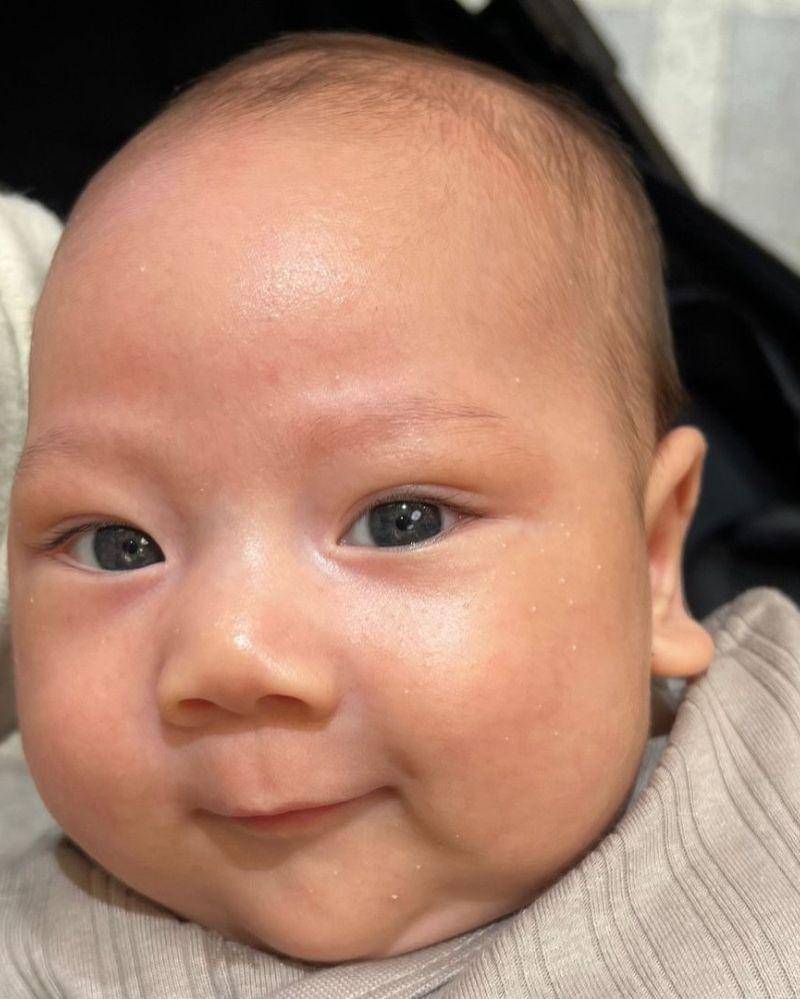 Beralih ke foto berikutnya, kali ini ada potret wajah Baby Calum yang diambil dari jarak cukup dekat. Dari foto ini, terlihat mata Baby Calum yang tampak berwarna abu-abu dan begitu indah.