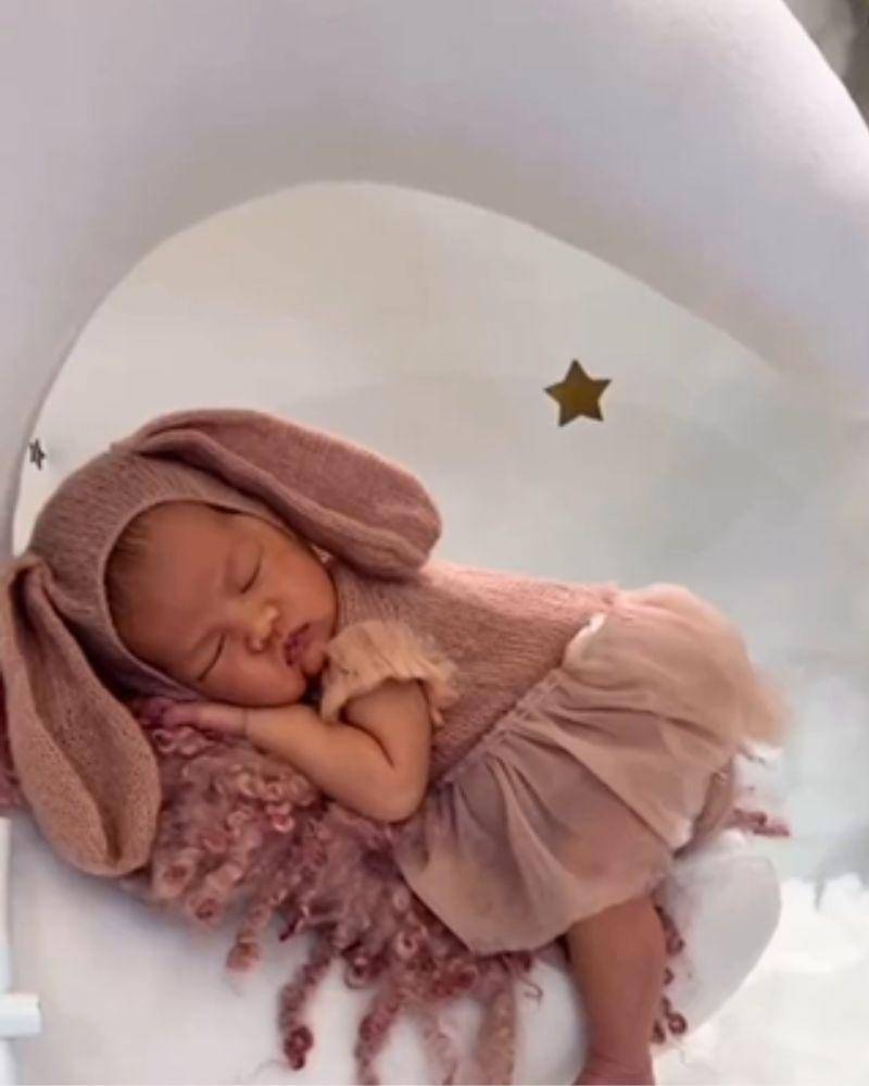 Baby Sheika tampak mengenakan dress berwarna dusty pink, serta kupluk yang menyerupai telinga kelinci. Sheika pun tampak pose tertidur nyenyak, seolah sedang hinggap di bulan.