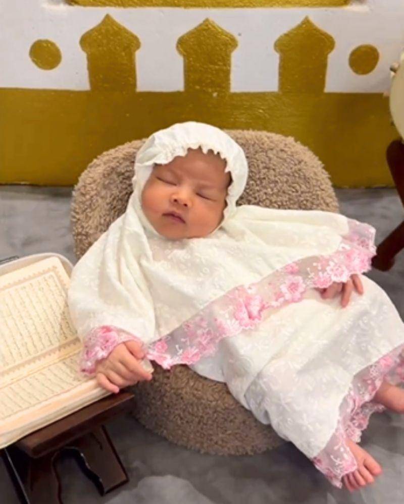 Untuk tema selanjutnya, Baby Sheika menjalani photoshoot dengan tema Islami. Bayi yang lahir pada 2 September ini tampil mengenakan mukena berwarna putih dengan renda berwarna pink.