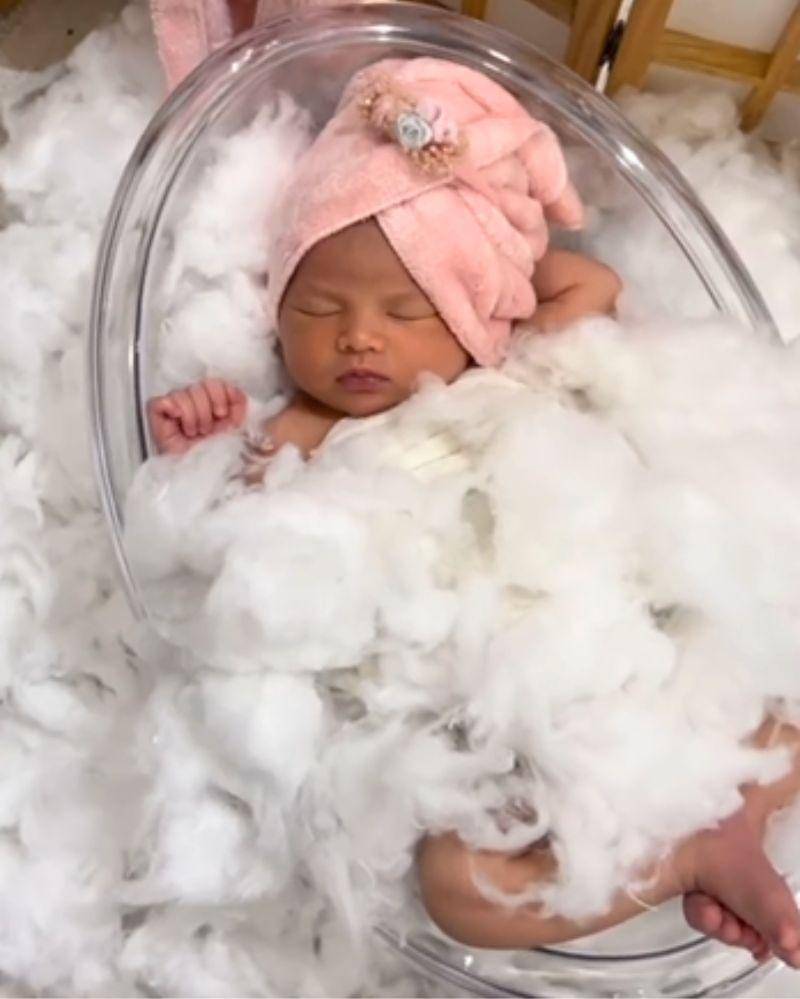 Kali ini, newborn photoshoot Baby Sheika tampak begitu menggemaskan. Ia tampak berbaring di sebuah bathtub mini yang dilengkapi properti menyerupai busa.