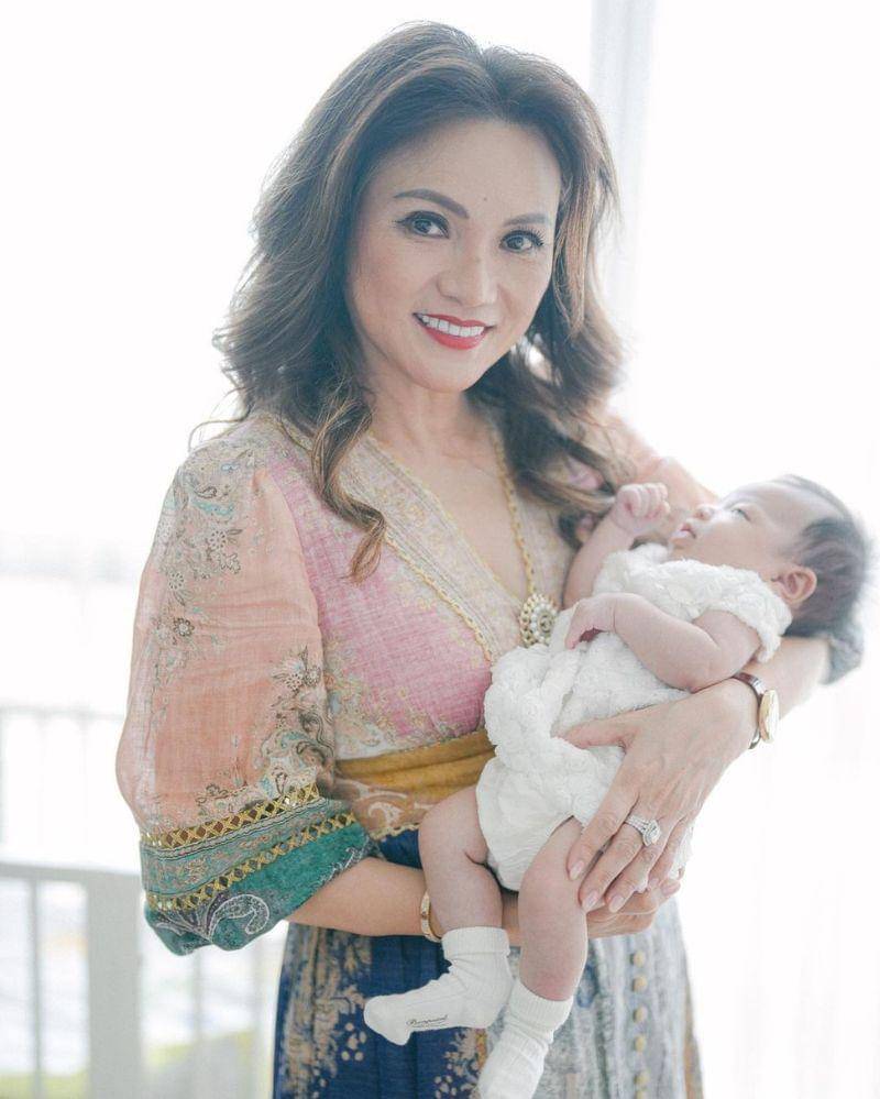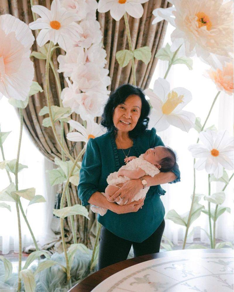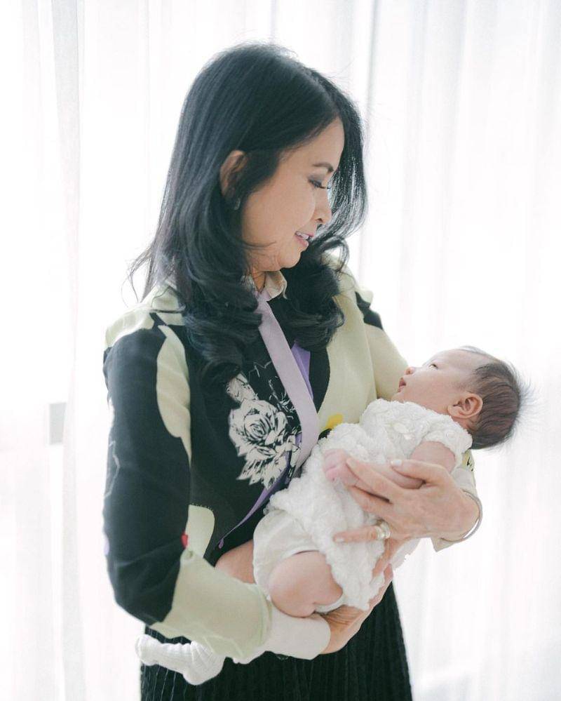 Ia pun tersenyum ke arah kamera sambil menggendong cucunya yang mengenakan busana serba putih. Baby Julia juga tampak anteng dan nyaman berada di gendongan neneknya.