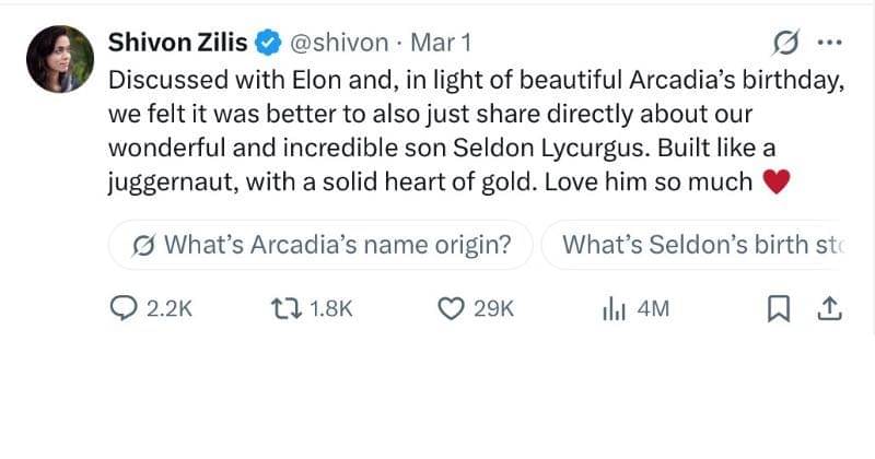 Kelahiran Seldon pertama kali diumumkan oleh Shivon Zilis melalui akun X (sebelumnya Twitter) pada 28 Februari 2025.