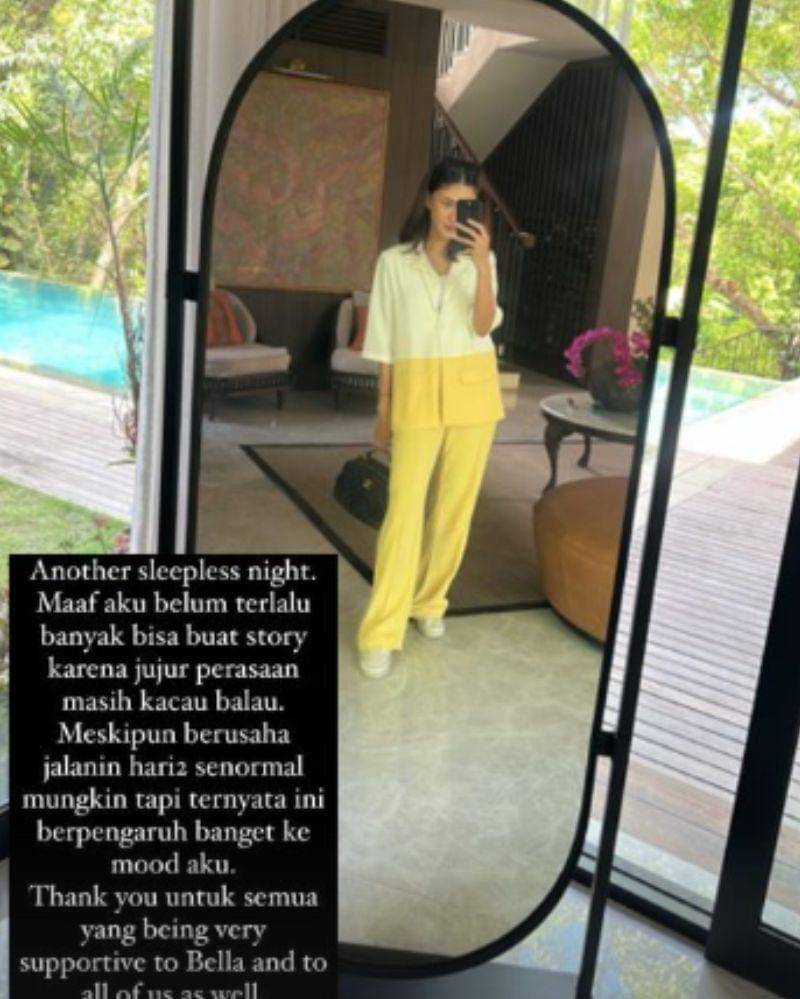 "Another sleepless night. Maaf aku belum terlalu banyak bisa buat story karena jujur perasaan masih kacau balau. Meskipun berusaha jalanin hari-hari senormal mungkin tapi ternyata ini berpengaruh banget ke mood aku. Thank you untuk semua yang being very supportive to Bella and to all of us as well. Let's all focus on how we can help from now on," terang Nana.