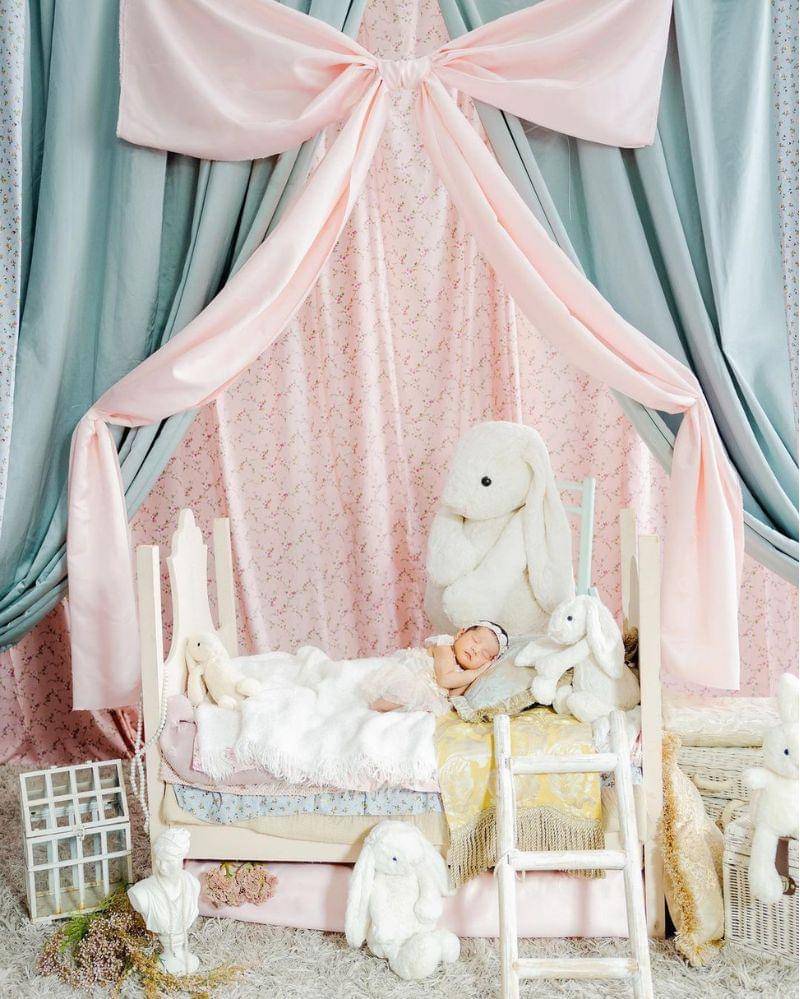 Nuansa pemotretan newborn Baby Brielle didominasi dengan warna pink dan juga putih. Baby Brielle sendiri mengenakan gaun cantik berwarna putih dengan bandana. Sedangkan, Pierce mengenakan jas berwarna pink pastel. Keren banget, deh!