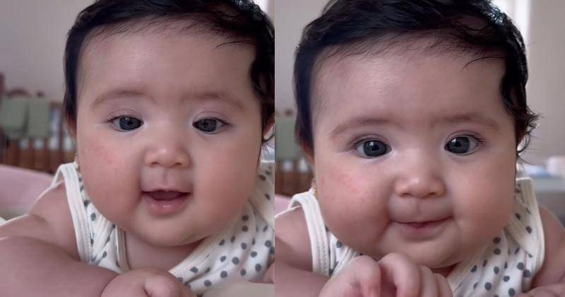 Pada beberapa foto yang baru-baru ini diunggah oleh Jessica Iskandar, terlihat Baby Hagia tersenyum ke arah kamera dan posisi tangannya memegang kepalanya.