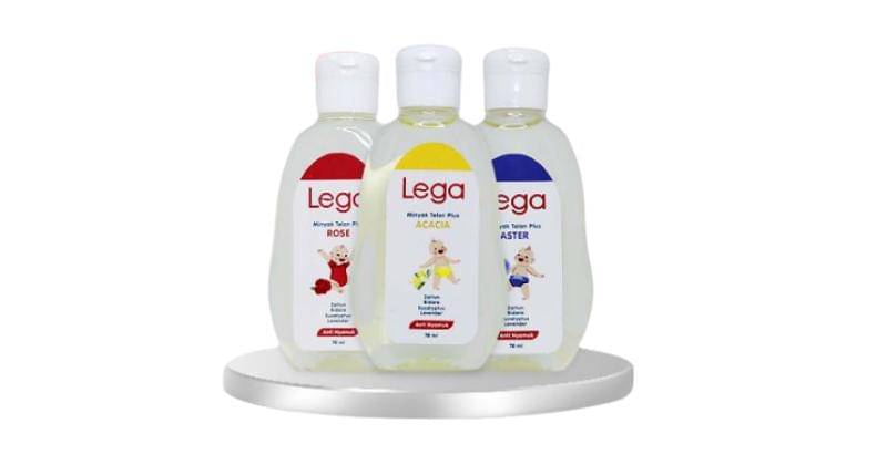 Minyak telon plus dari Lega memiliki tiga varian aroma alami, mulai dari rose, acacia, dan aster. Minyak ini mengandung 8 kandungan, yaitu minyak adas, minyak kayu putih, bidara, zaitun, lavender, eucalyptus, minyak kelapa, dan minyak aromatik.