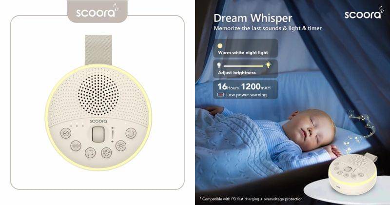 Scoora Dream Whisper adalah speaker portable yang menghasilkan 21 suara berbeda, mulai dari white noise, suara alam, suara angin, dan musik pembawa tidur.