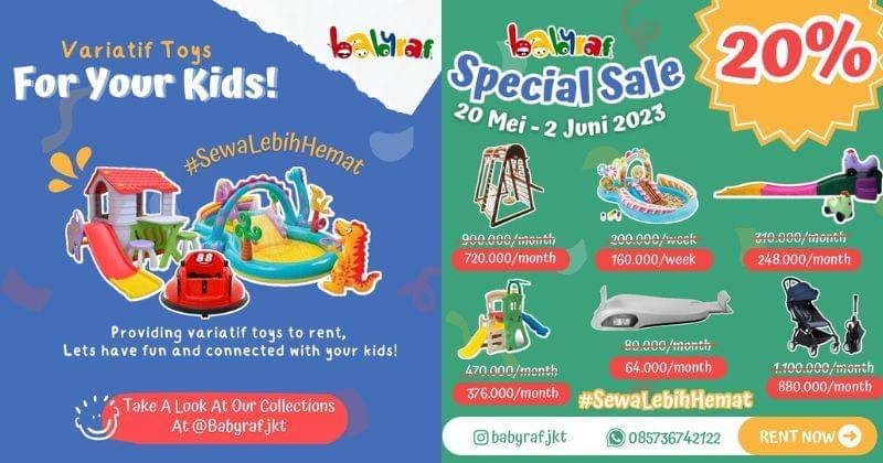 BabyRaf merupakan tempat penyewaan mainan dan perlengkapan bayi yang berlokasi di Jakarta Selatan. Perlengkapan bayi di BabyRaf tentunya sudah terjamin kebersihan dan keamanannya.