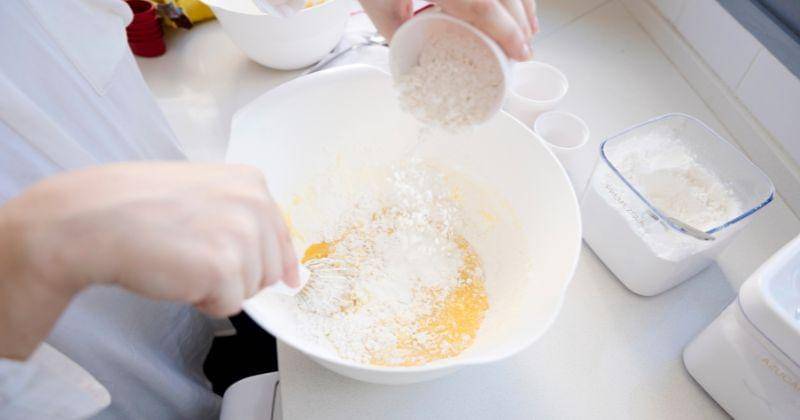 - Kocok margarin dan kuning telur hingga lembut dengan menggunakan whisker.