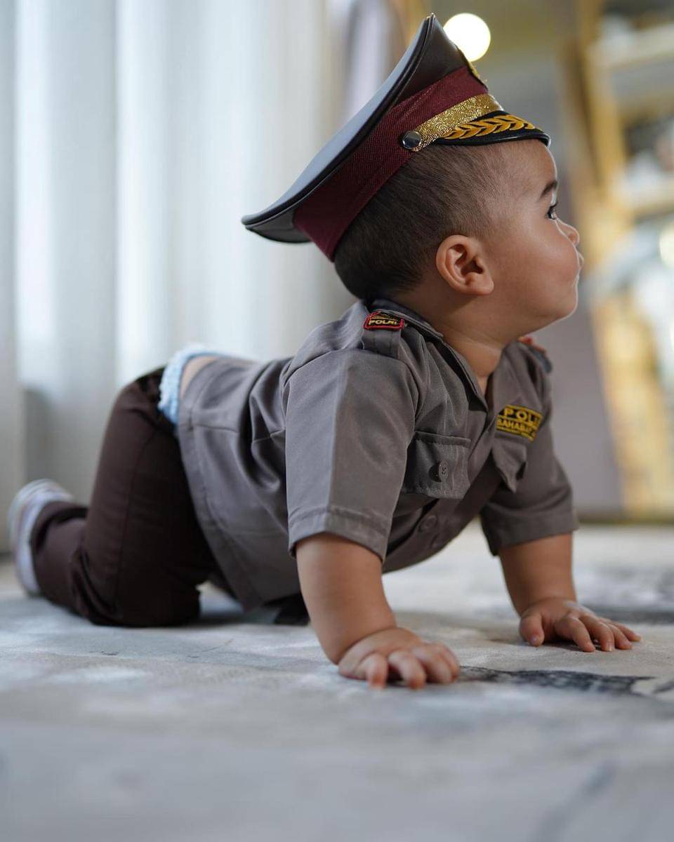 Ia mengenakan topi khas polisi lengkap dengan lencana bahu hingga nama depan. Hanya sepatu Isa saja yang masih berusa sneakers karena masih bayi nih. Meski begitu sudah 'polisi banget' ya!