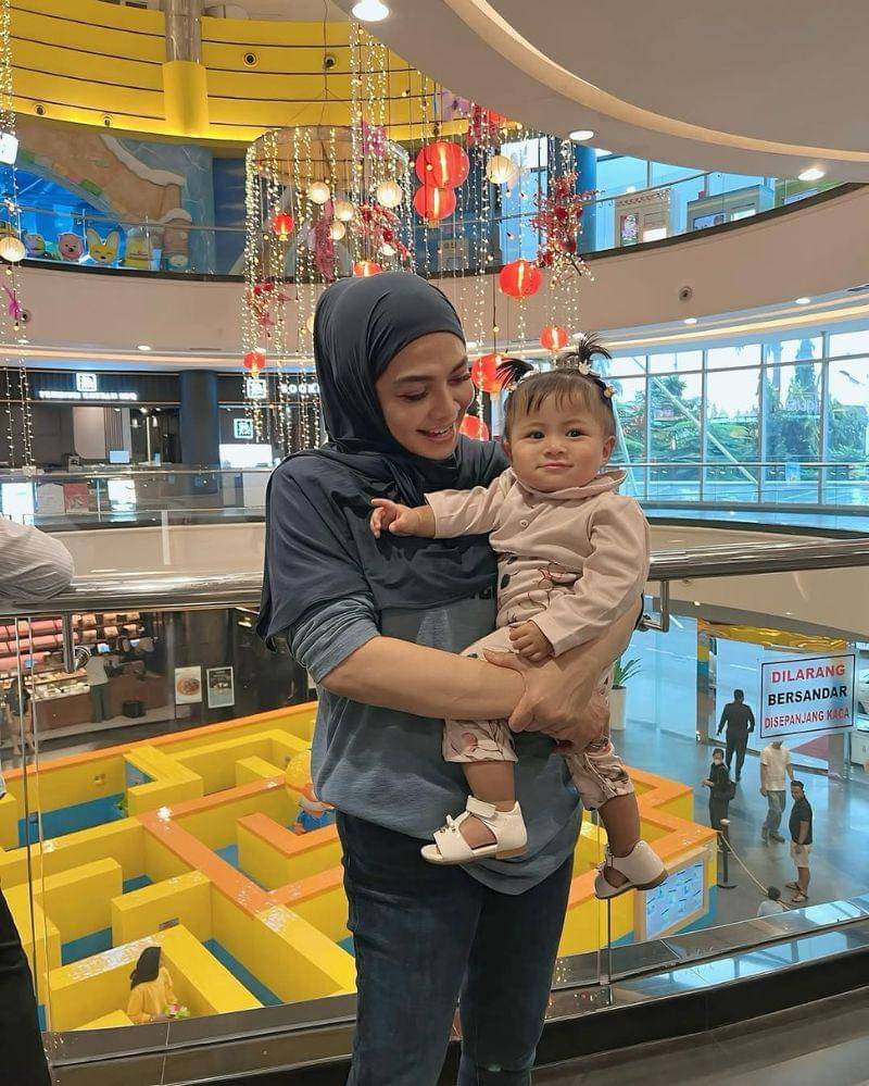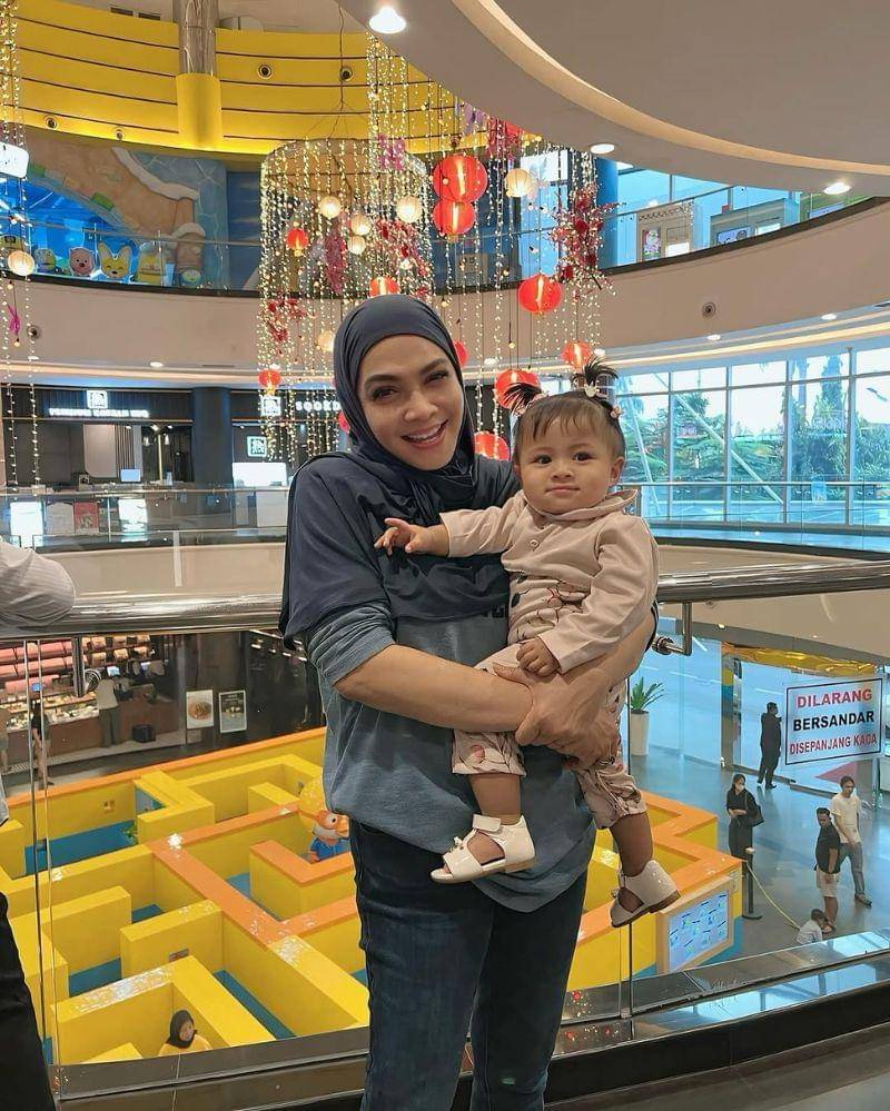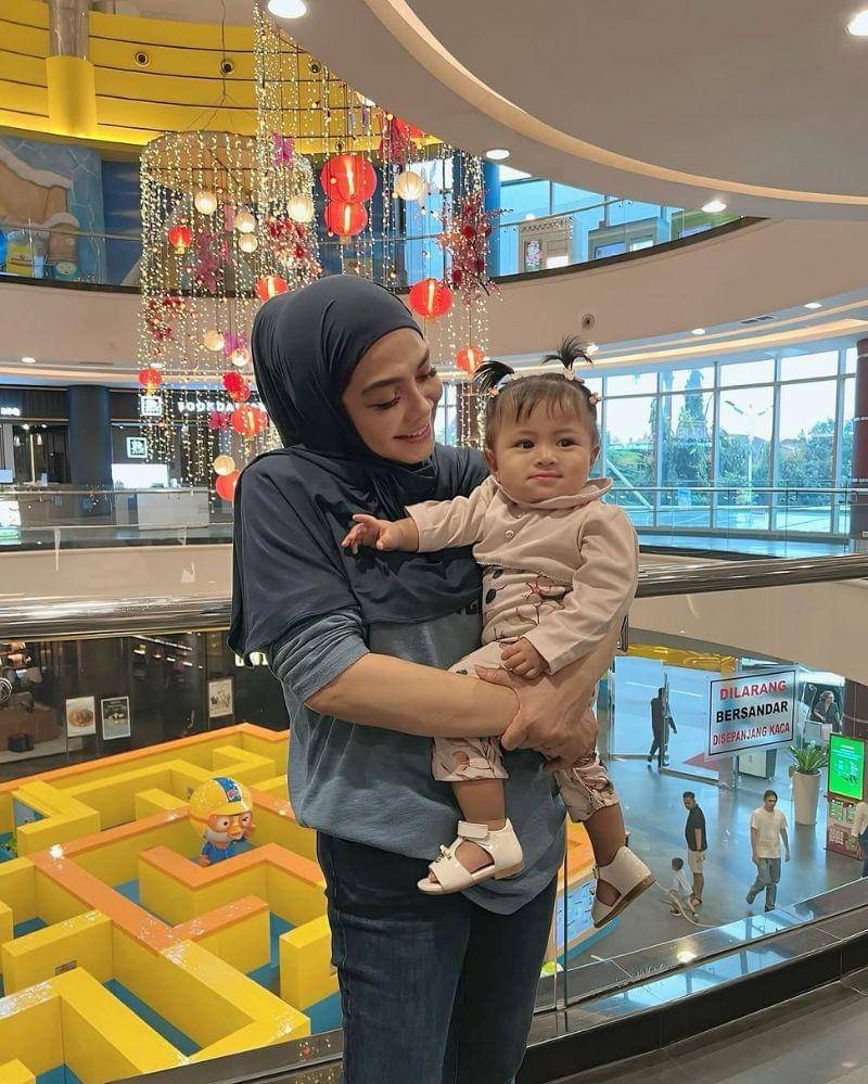 Dalam foto yang diunggah di akun Instagram @rieta_amilia, Rieta Amalia terlihat sedang menggendong Baby Lily. Baby Lily tampil cute dengan baju berwarna pink dan sepatu putih.