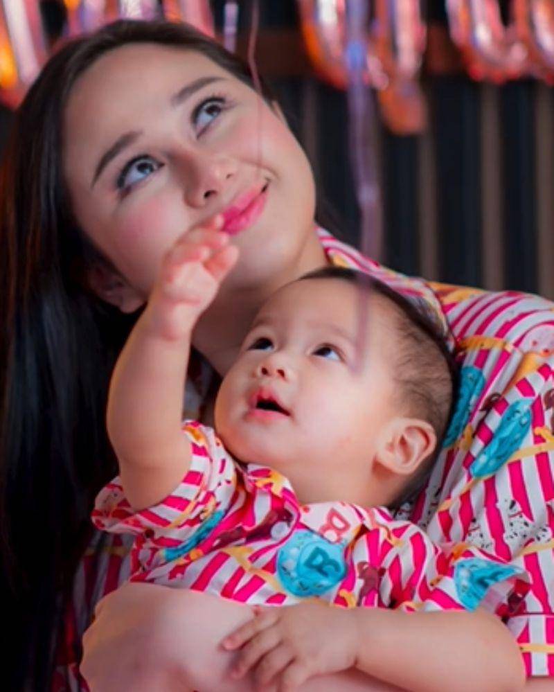 Baby Jaden tampak begitu menggemaskan saat mengenakan baju kembaran dengan sang Mama. Keduanya tampil kompak dengan piama dengan motif belang-belang berwarna pink.