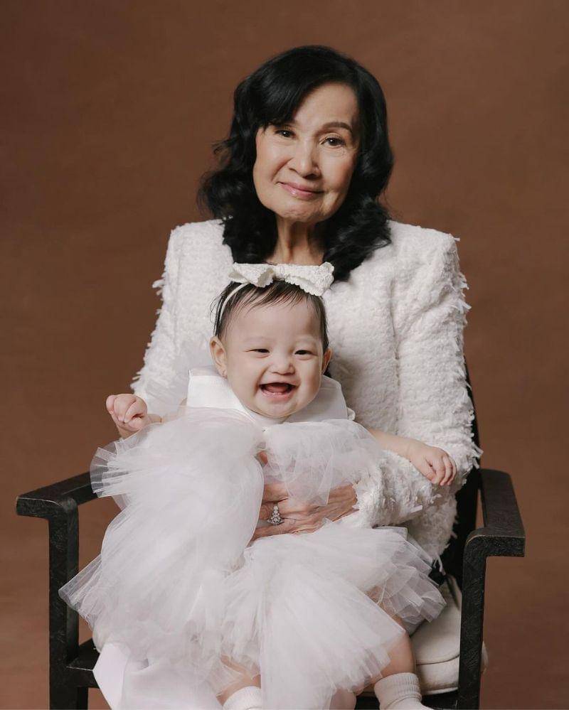 Beralih ke foto selanjutnya, kali ini ada foto Baby Julia bersama nenek buyutnya. Quita Andreani Wibisono yang sedang duduk di sebuah kursi tampak memangku Baby Julia sambil berpose ke arah kamera.
