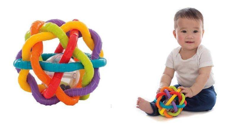 Untuk melatih gerakan motorik tangan si Kecil yang mungil, Mama bisa membelikan mainan bola yang mudah digenggam. Misalnya bola lucu dari Playgro Bendy Ball.