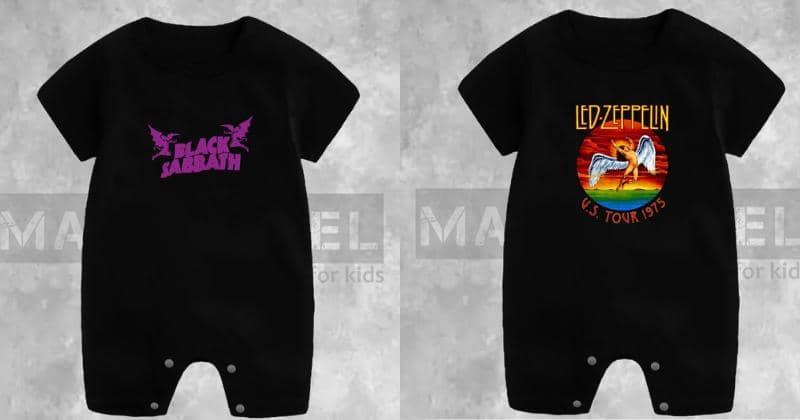 Playsuit selanjutnya merupakan produk dari toko Mac Darrel yang menyediakan playsuit band metal. Jika si Papa mengidolakan band metal, playsuit ini bisa Mama pilih agar si Kecil dan Papanya menggunakan baju kembar, Ma.