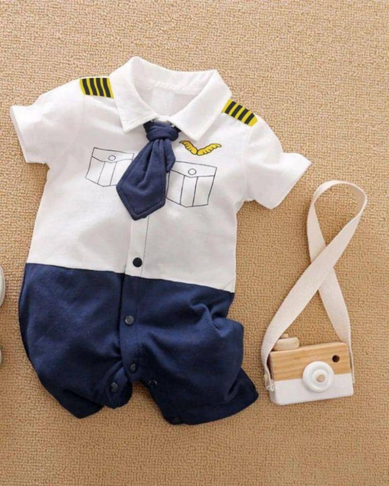 Pakaian bayi selanjutnya bermotif baju pilot, sangat lucu untuk dipakai si Kecil yang akan menjadi pilot cilik, Ma. Pakaian ini berbahan 100% katun yang super lembut. Model ini juga cukup jarang sehingga akan membuat si Kecil jadi pusat perhatian.