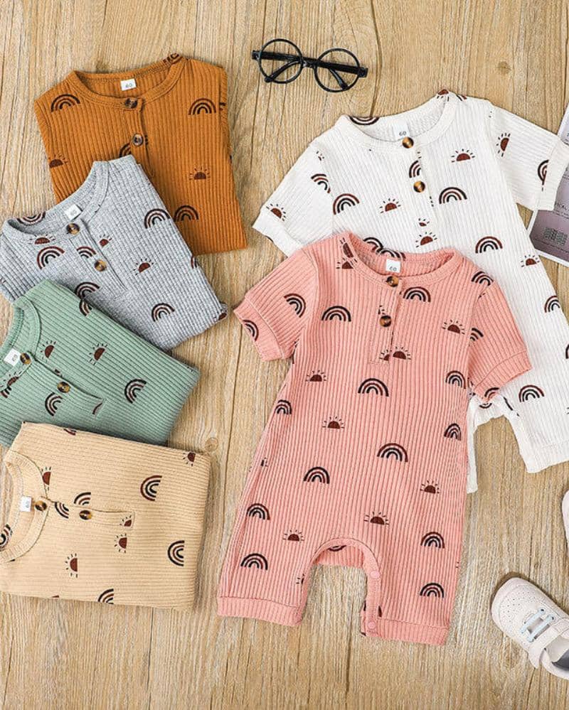 Playsuit ini memiliki motif pelangi dan matahari. Selain itu, bisa juga digunakan untuk bayi perempuan maupun laki-laki. Bahannya terbuat dari katun yang nyaman, lembut, dan halus.