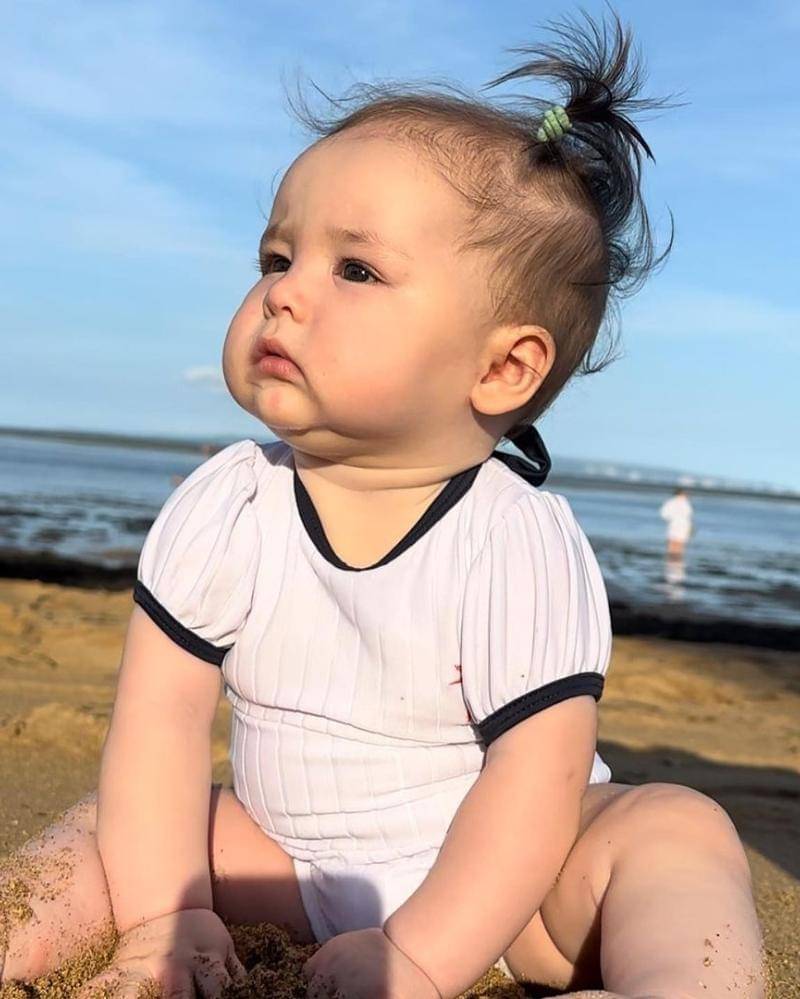 Rambut yang masih tipis tersebut juga tertiup angin pantai sehingga terlihat sedikit berantakan. Meski demikian, Kamari tetap gemas, bukan, Ma?