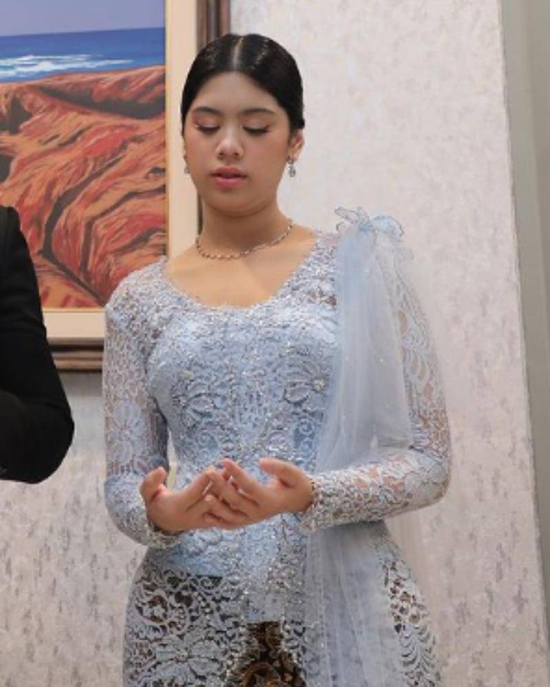 Cucu tertua dari SBY ini terlihat rambutnya disanggul sama seperti sang Mama. Almira juga terlihat membawa sebuah tas berwarna biru yang serasi dengan warna kebayanya.