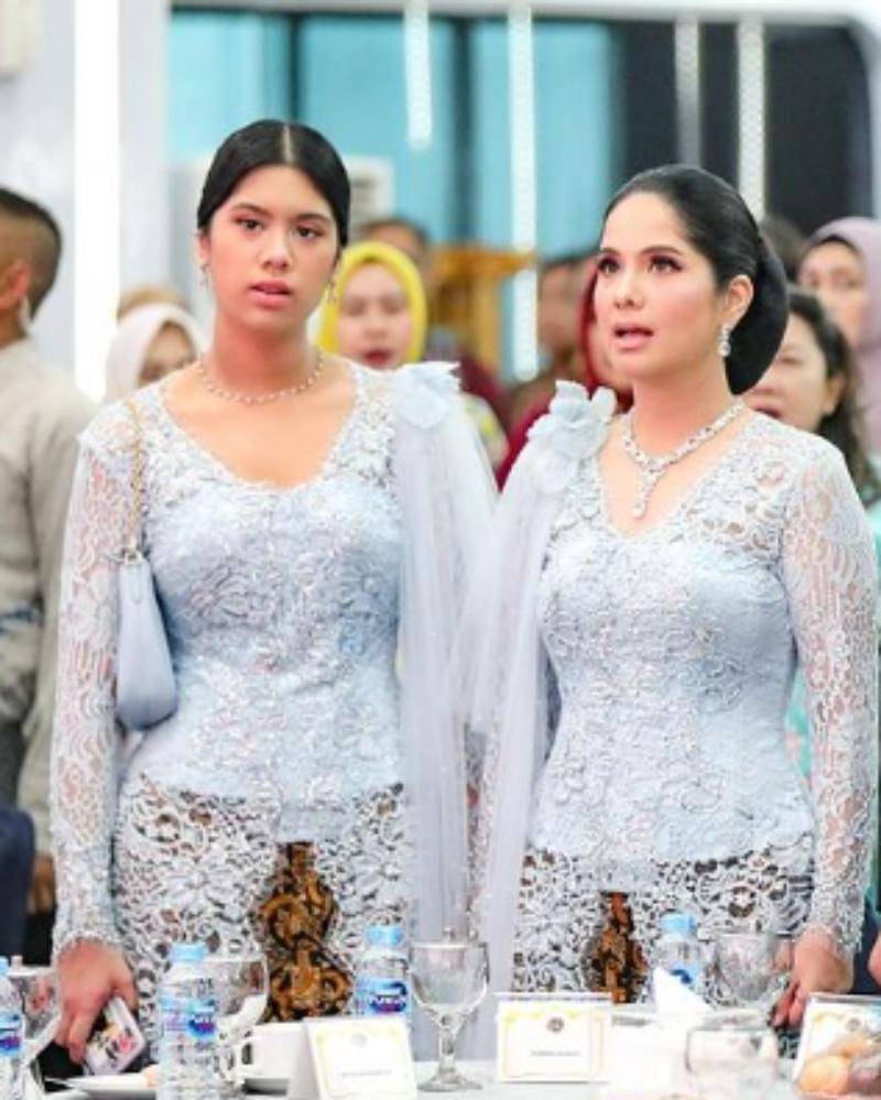 Almira hadir mengenakan kebaya brokat berwarna baby blue yang serasi dengan Annisa. Dengan tambahan aksen organza panjang pada bagian pundak serta dihiasi dengan aksesori bunga besar.