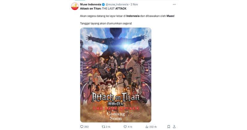 Attack on Titan: The Last Attack mulai tayang di Jepang pada 8 November 2024, namun belum ada kepastian lebih lanjut mengenai kapan tanggal rilis movie ini.