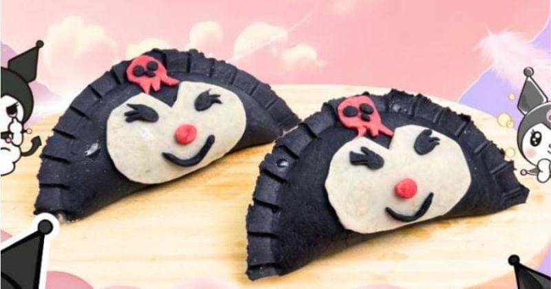 - Gunakan sisa adonan pertama untuk membuat tanduk, mata dan mulut Kuromi. Tempelkan tanduk pada adonan yang sudah diisi keju.