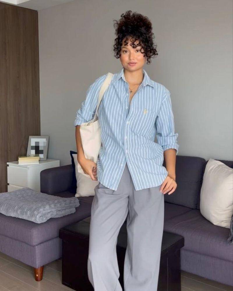 Cobalah kombinasikan celana abu-abu dengan atasan biru muda, meski simpel tetap perlihatkan tampilan kasual yang pas buat aktivitas sehari-hari.
