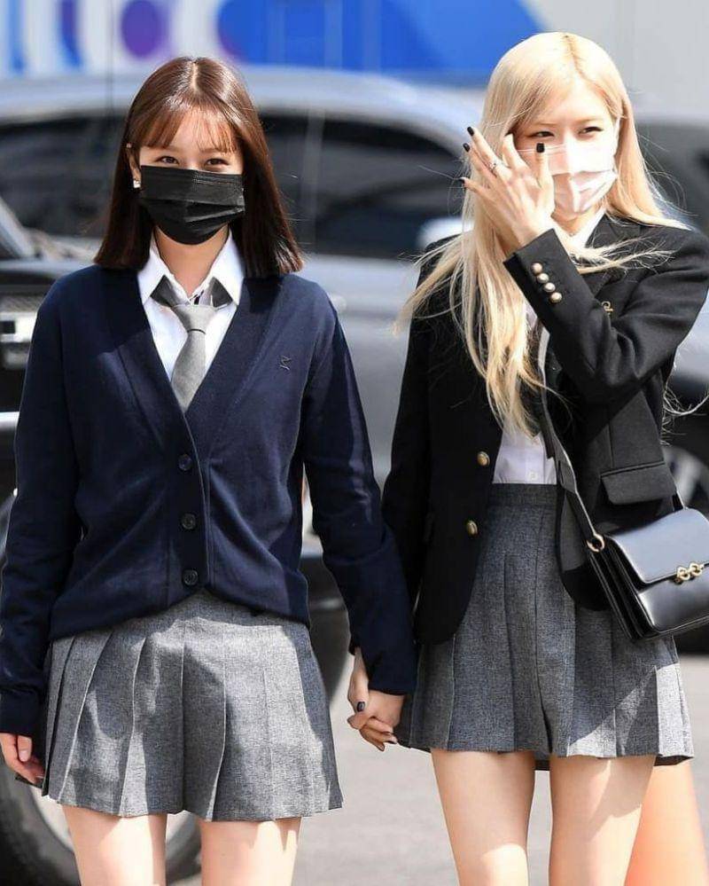 Kedua member girl grup Kpop ini menjadi sorotan penggemar saat menuju lokasi shooting. Rose dan Hyeri nampak saling bergandeng tangan dan mengenakan pakaian seragam sekolah senada. Kompak bak kakka beradik nih!