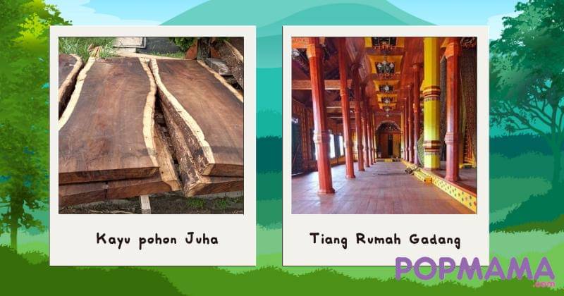 Tiang utama Rumah Gadang dibangun menggunakan kayu Pohon Juha tua berdiameter 40-60 cm, nantinya kayu tersebut akan direndam bertahun-tahun dalam kolam. Baru kemudian diangkat melalui prosesi adat yang disebut mambangkik batang tarandam (membangkitkan pohon direndam). Kayu ini dikenal sangat kuat dan tahan lama.
